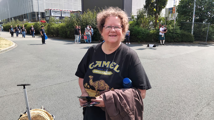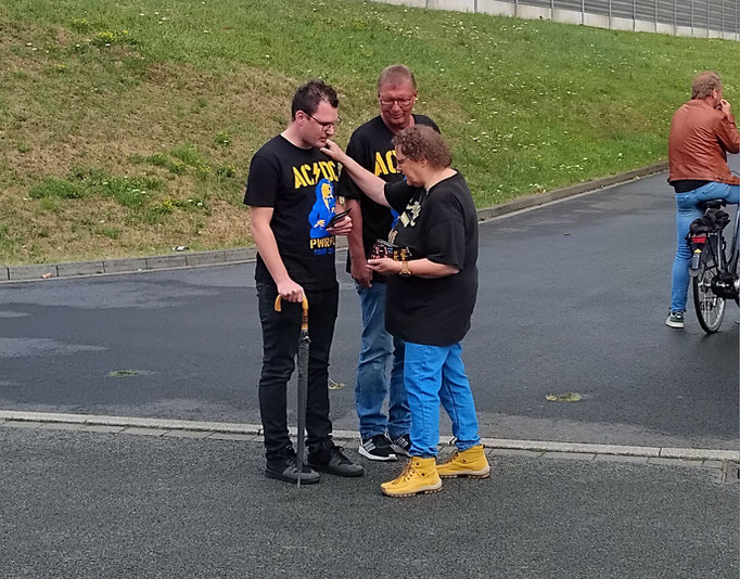 2.000 Flyer in 2 Stunden an AC/DC-Fans verteilt! Meine Gebetsschwester Stephanie war das erste mal mit mir evangelistisch unterwegs, wir hatten sie mit dem T-Shirt ihres Mannes dieser Szene